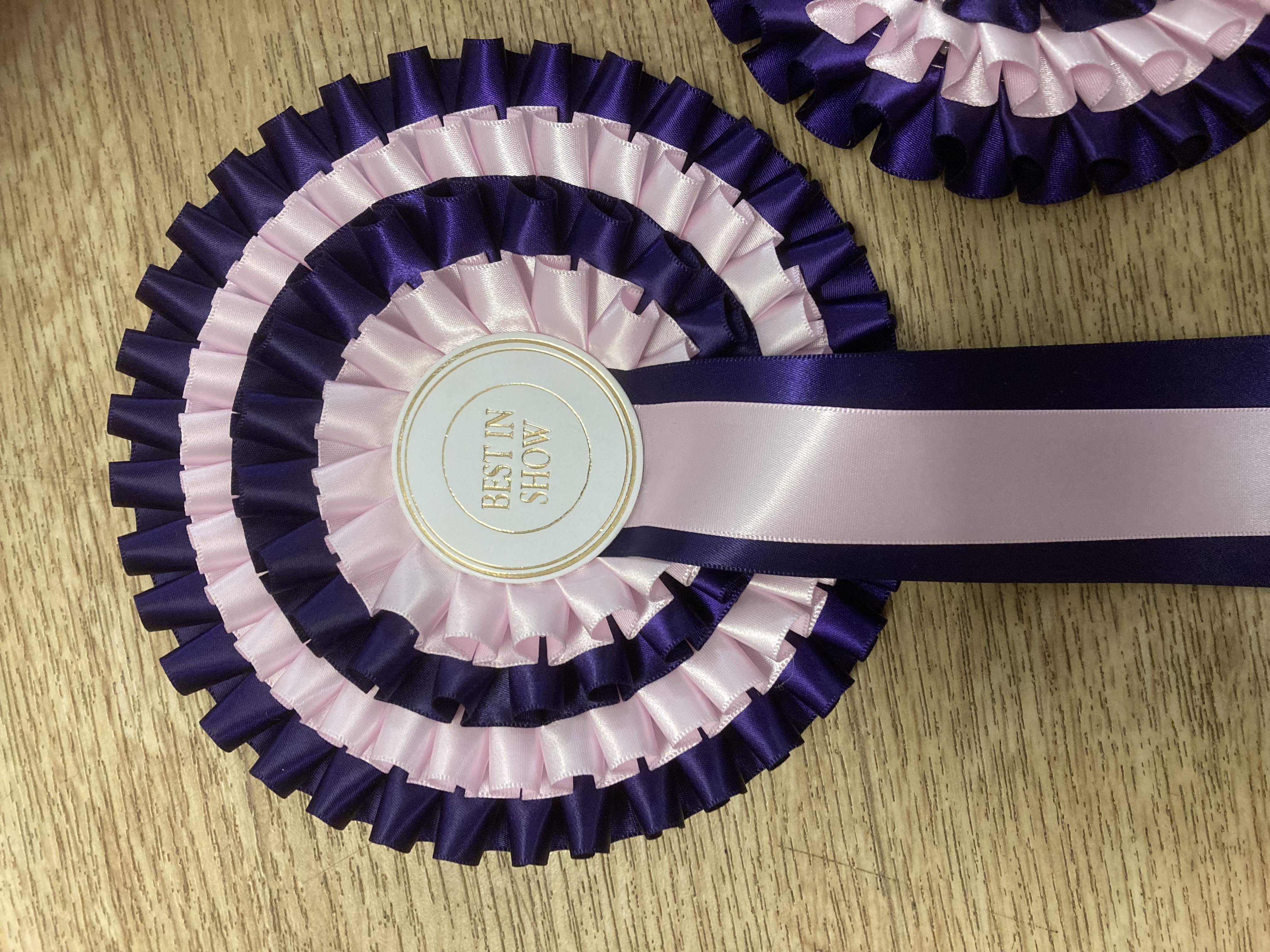 Best in show/Reserve Best in show rosettes. Three tier. Purple/Pink.
