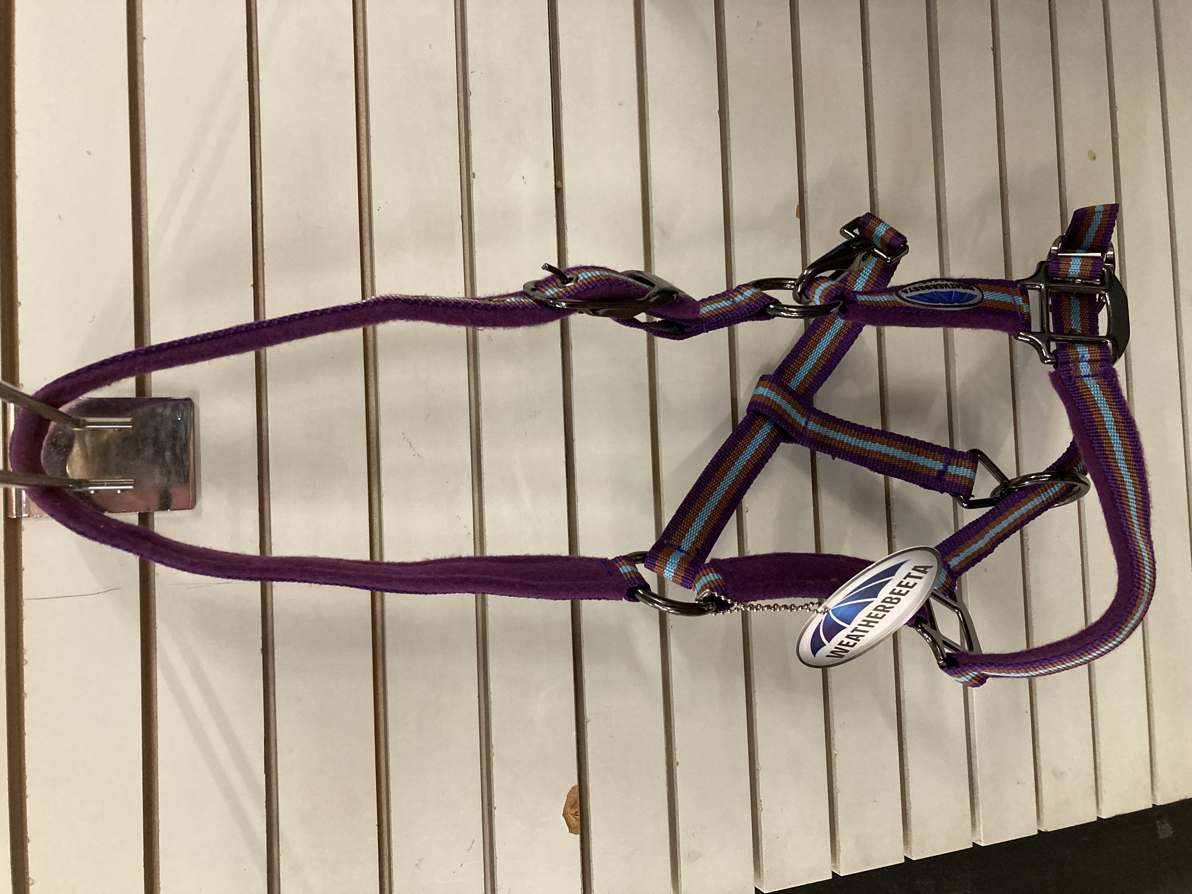 Welcome to our store, where we bring you the best in equestrian gear! Introducing the Weatherbeeta Pony Striped Headcollar in a vibrant purple, brown, and turquoise colour combination. This headcollar is brand new with tags, ready to add a pop of colour to your pony's wardrobe.